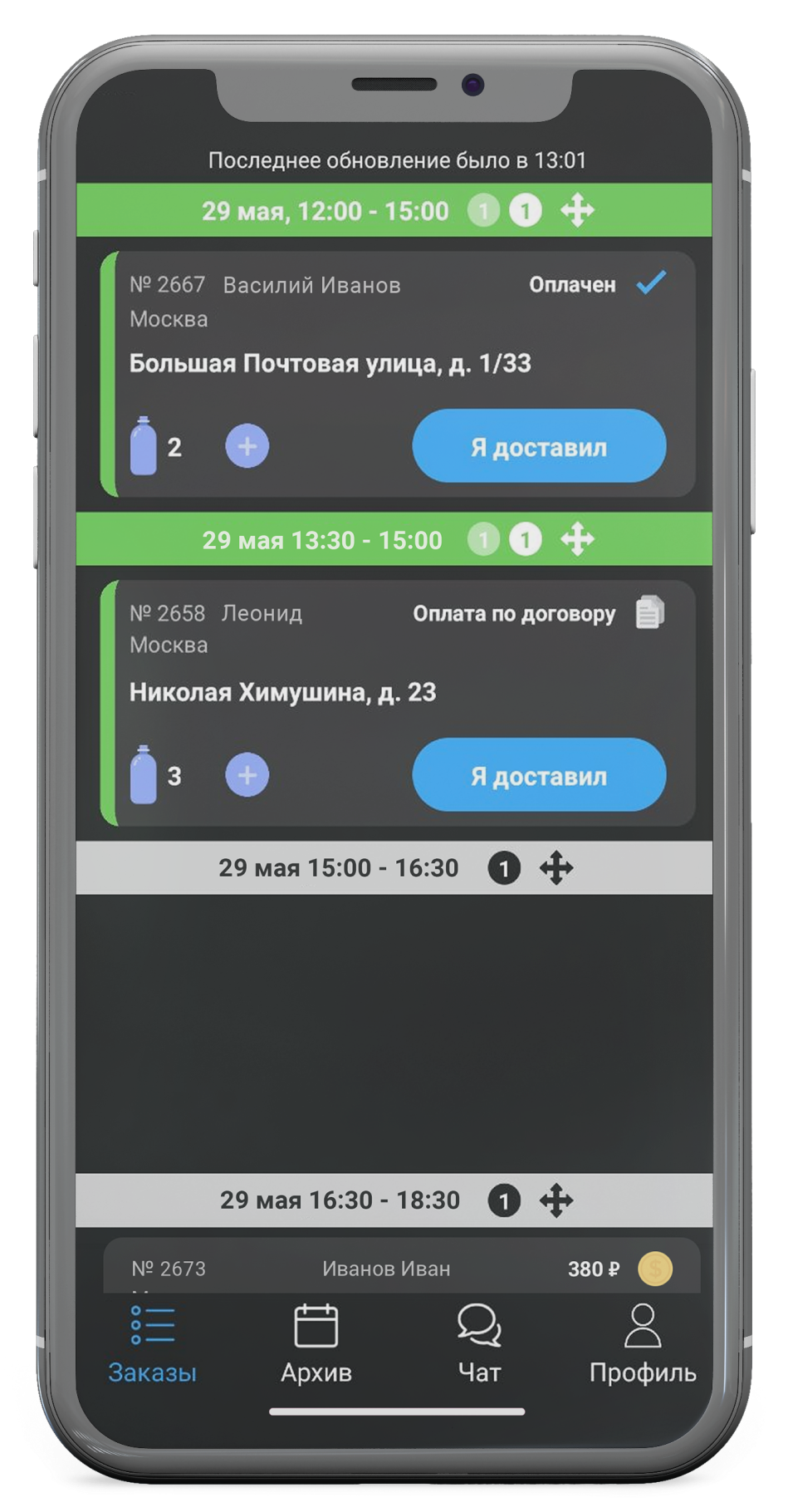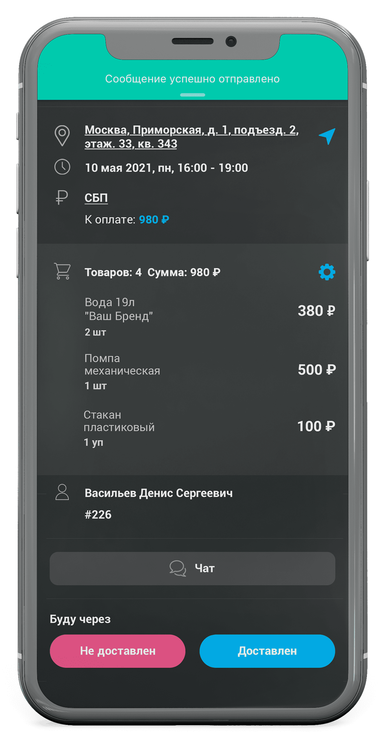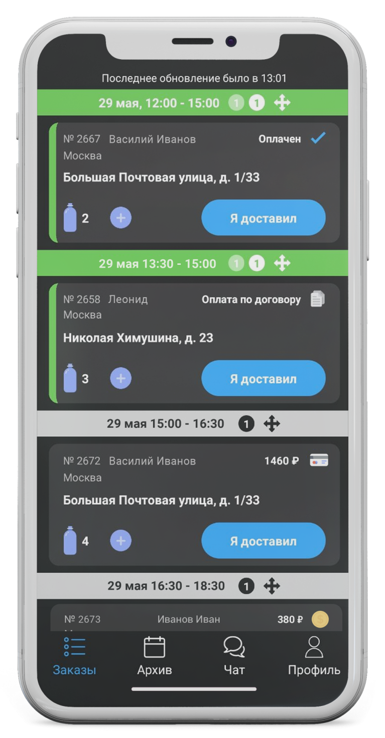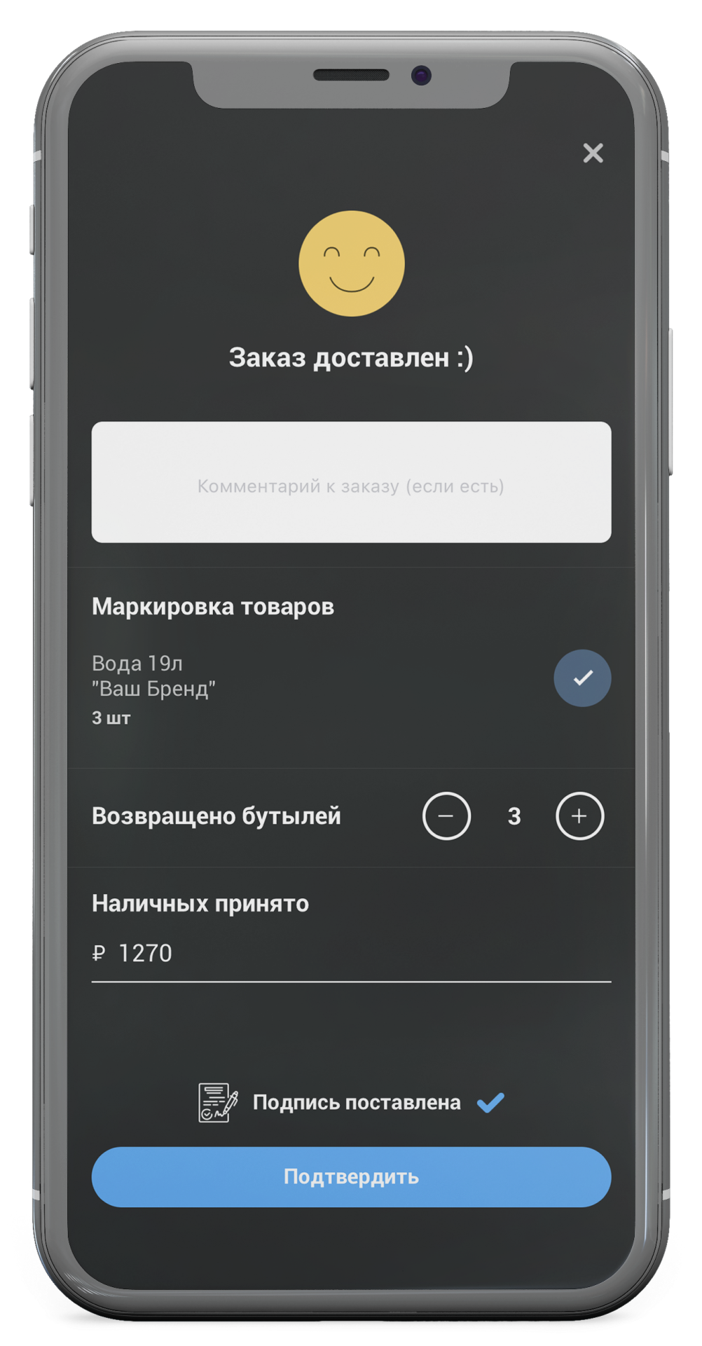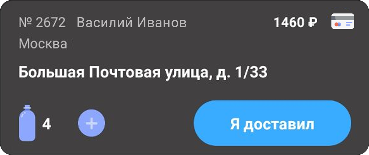 Во время доставки водитель нажимает кнопку «Доставлен», ставит подпись в приложении, указывает количество принятых бутылей и денежных средств.