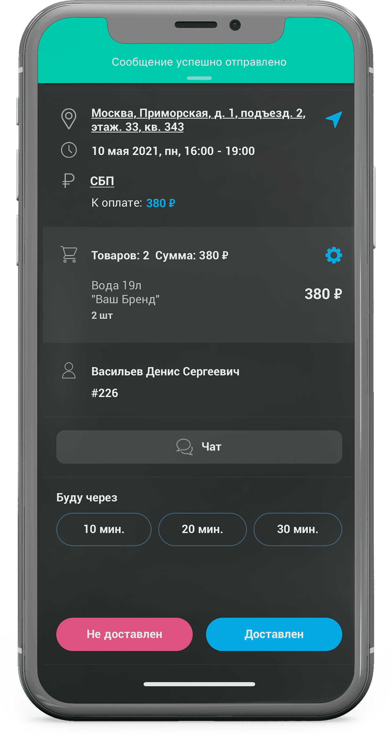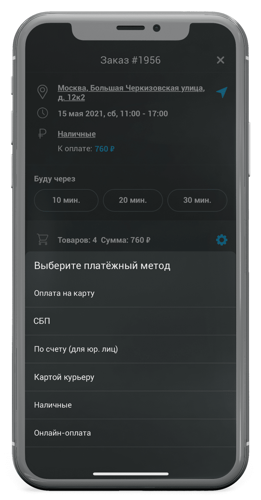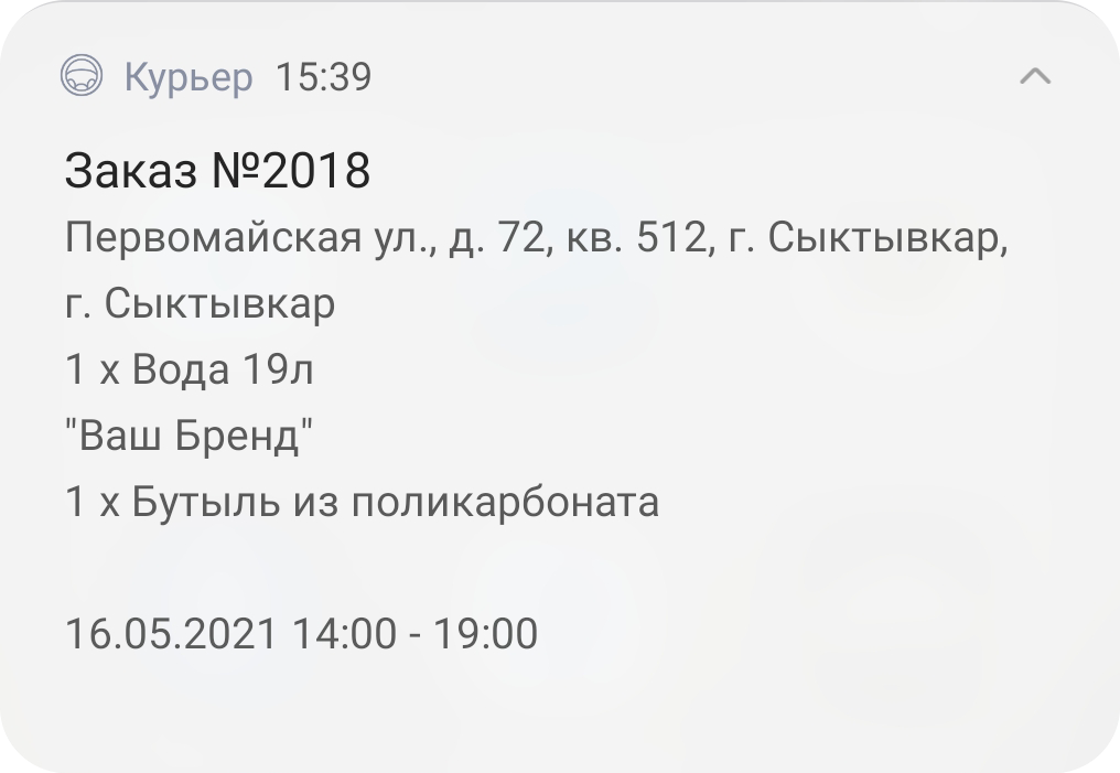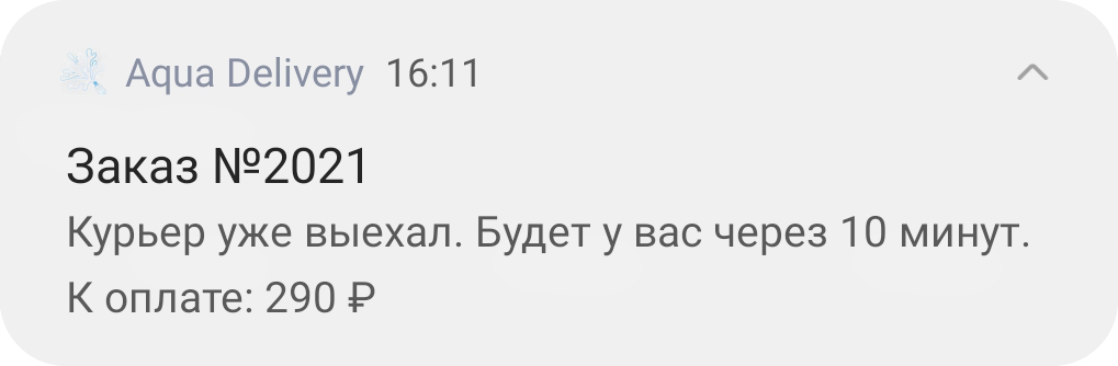Курьер получает заказ на свой смартфон, выстраивает маршрут в 2GIS или Google-картах и отправляет клиенту push-уведомление «Буду через N минут».