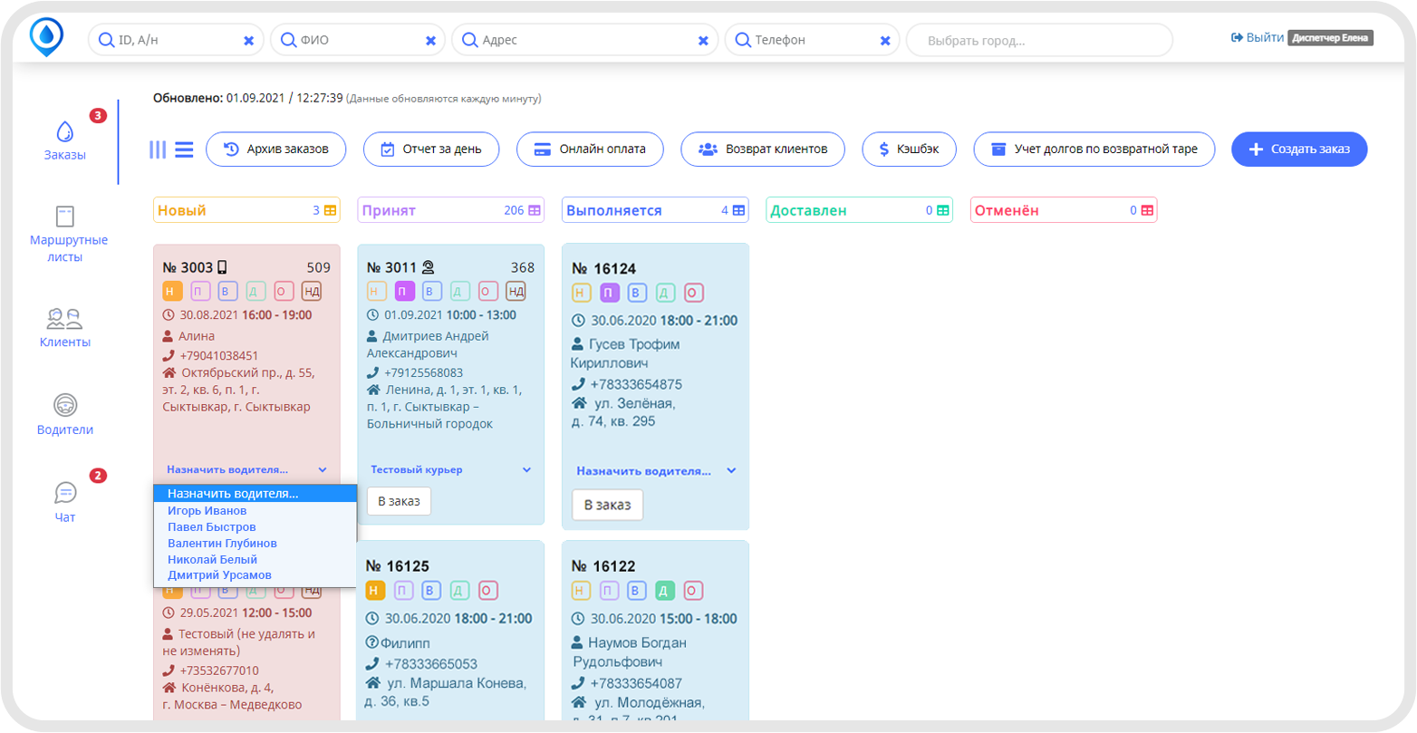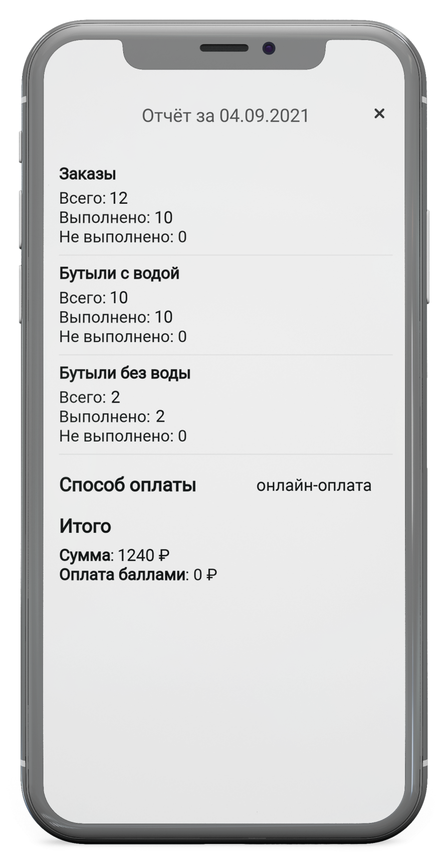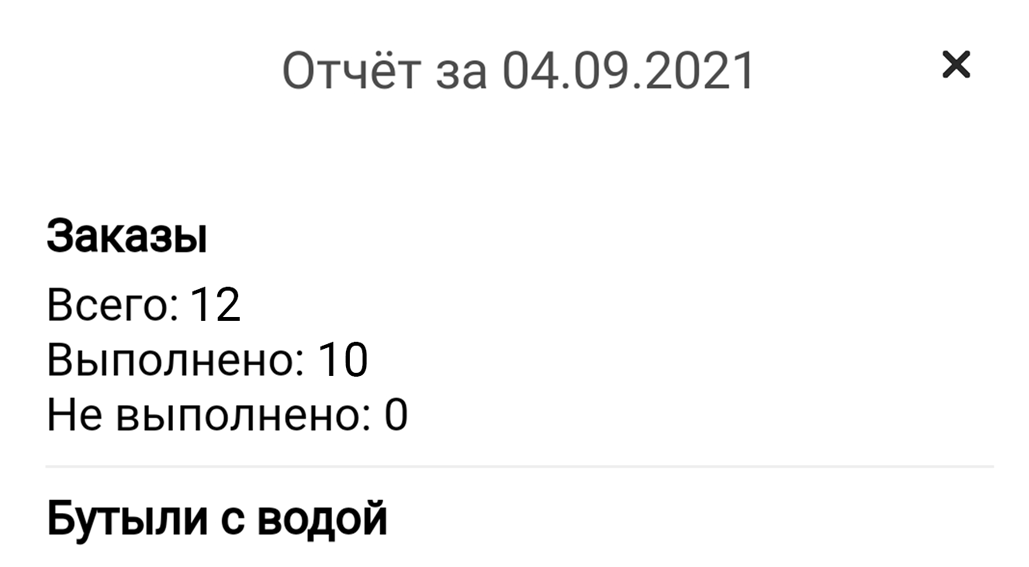 Курьер может сформировать отчет за день, в котором будет отражено: количество бутылей, принятых наличных и выполненных заказов. Количество возвратной тары и денег также указывается в карточке заказа.