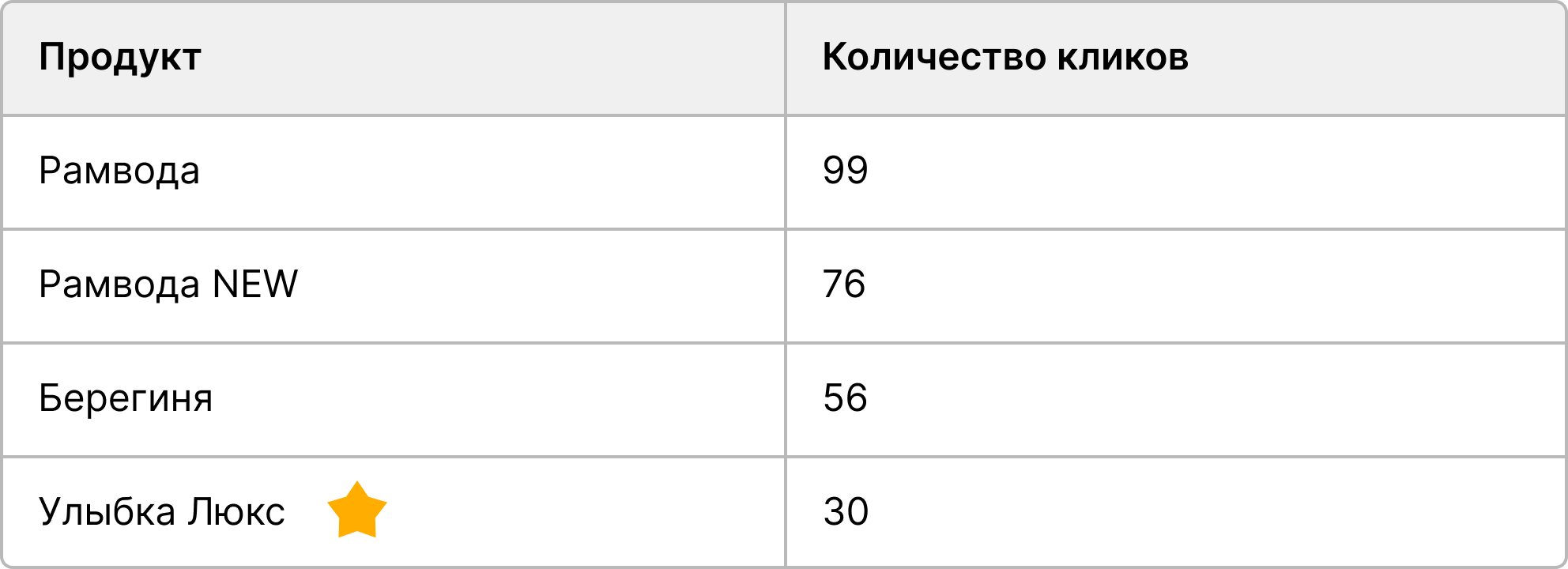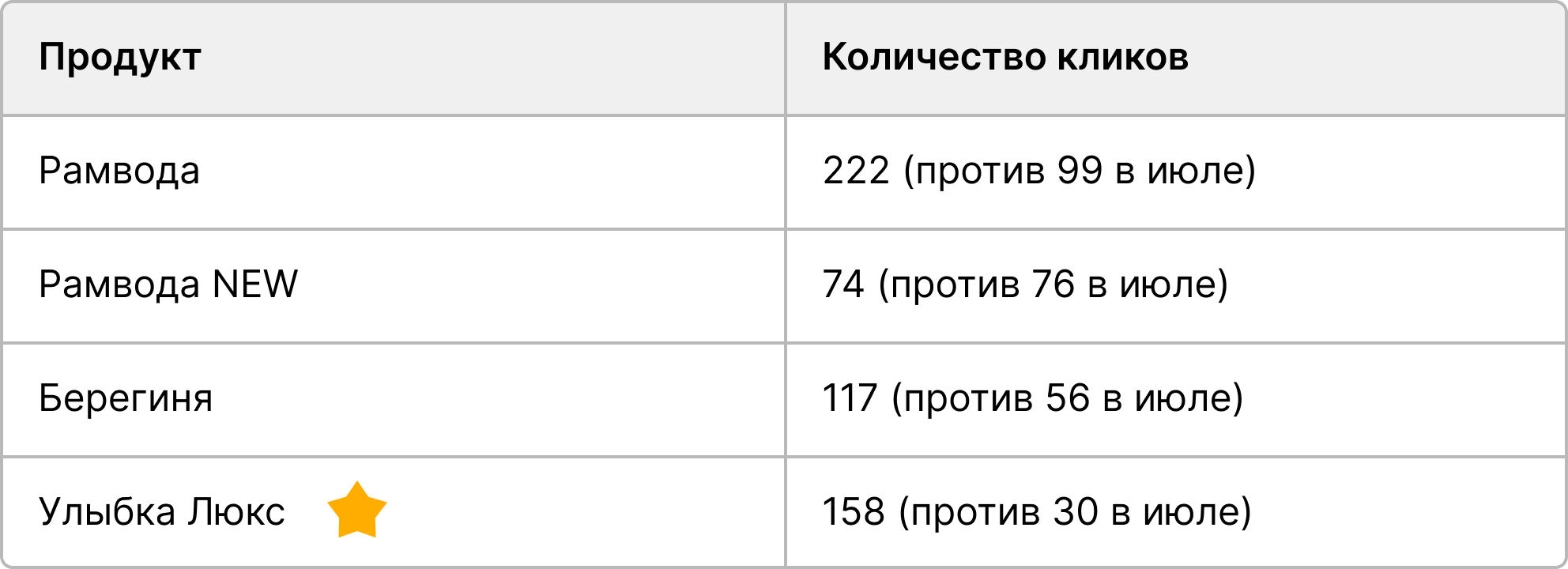 1. Провели мониторинг кликов по основным продуктам за июль (до внедрения функции)