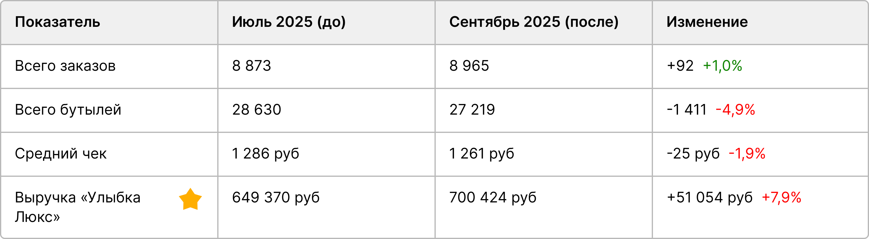 Количество заказов воды «Улыбка Люкс» выросло на 11.9% и принесло дополнительные 51 054 рубля выручки за два месяца тестирования.